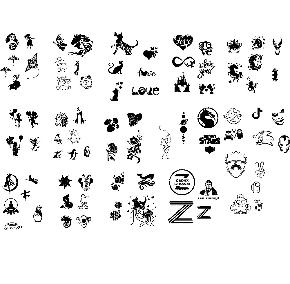 Новый профессиональный набор трафаретов для аэротату и блеск тату на жесткой самоклеящейся виниловой пленке многоразового использования.