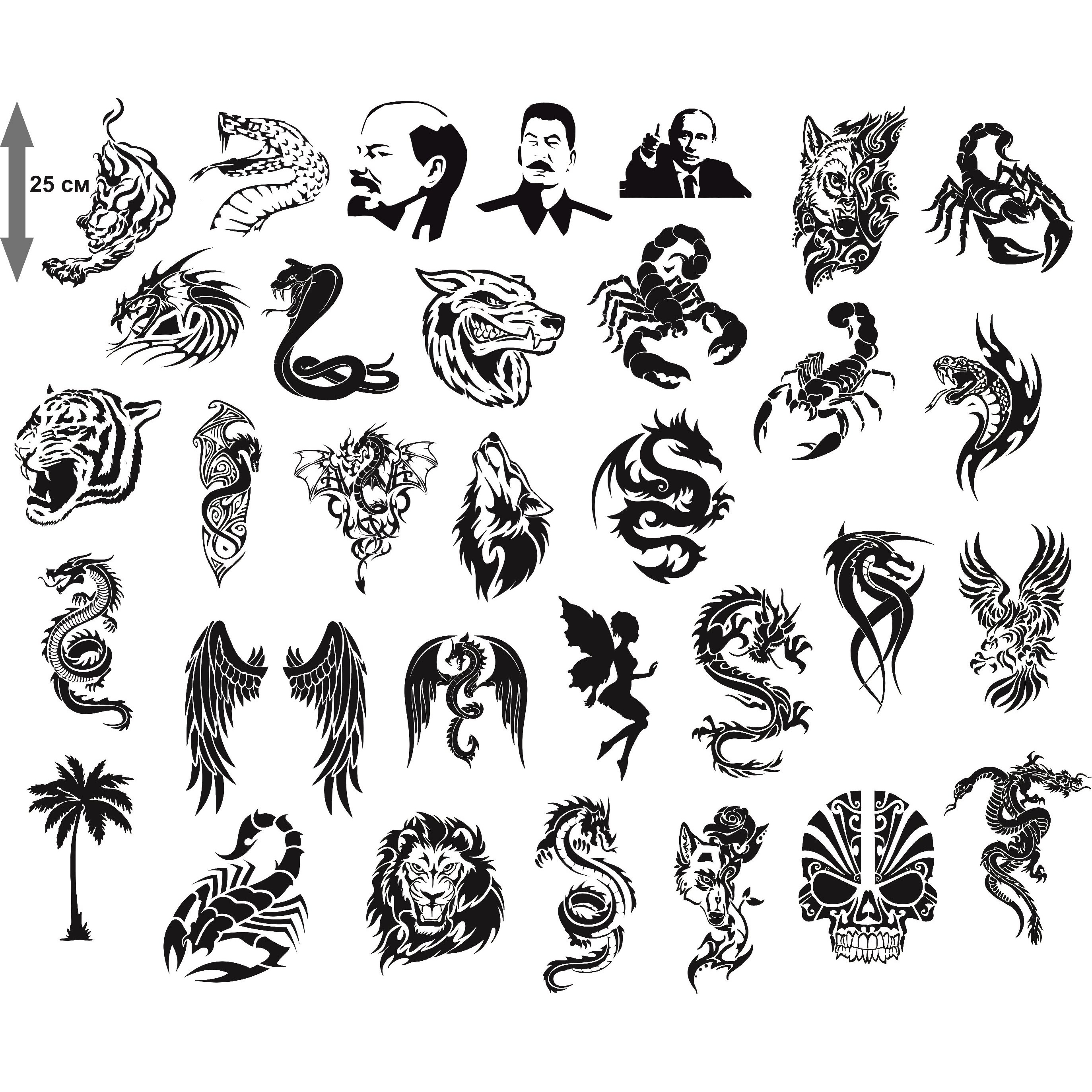 Состоит из 33 рисунков огромного размера (от 25 см до 27 см) популярых для данного размера тематик: змеи, дракны, головы животных, скормионы, феи, кобры, Ленин, Путин.